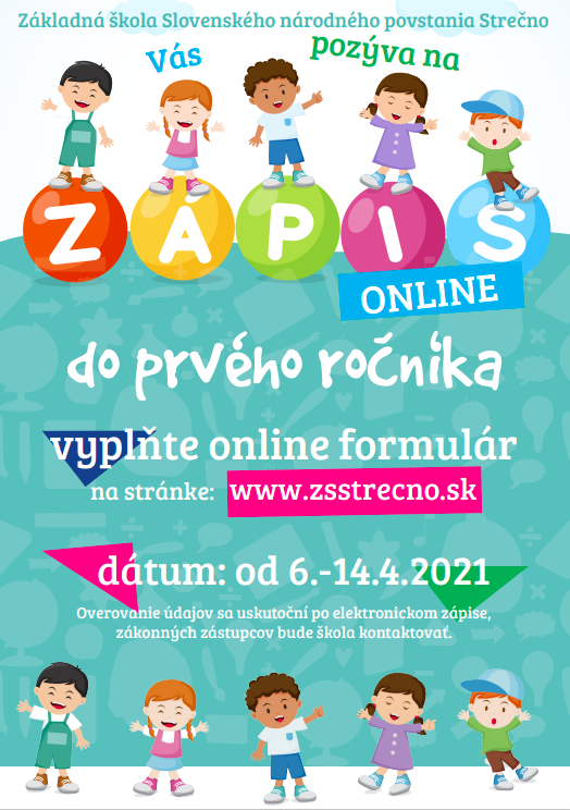Základná škola Slovenského národného povstania v Strečne oznamuje rodičom, že zápis detí do 1. ročníka ZŠ v školskom roku 2021/2022, bude aj v tomto roku prebiehať online od 6.4.2021 do 14.4.2021. Formulár je zverejnený na stránke školy http://www.zsstrecno.sk