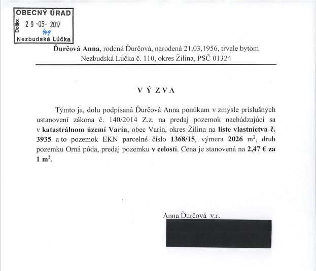 Výzva – ponuka na predaj pozemku v katastri obce Varín