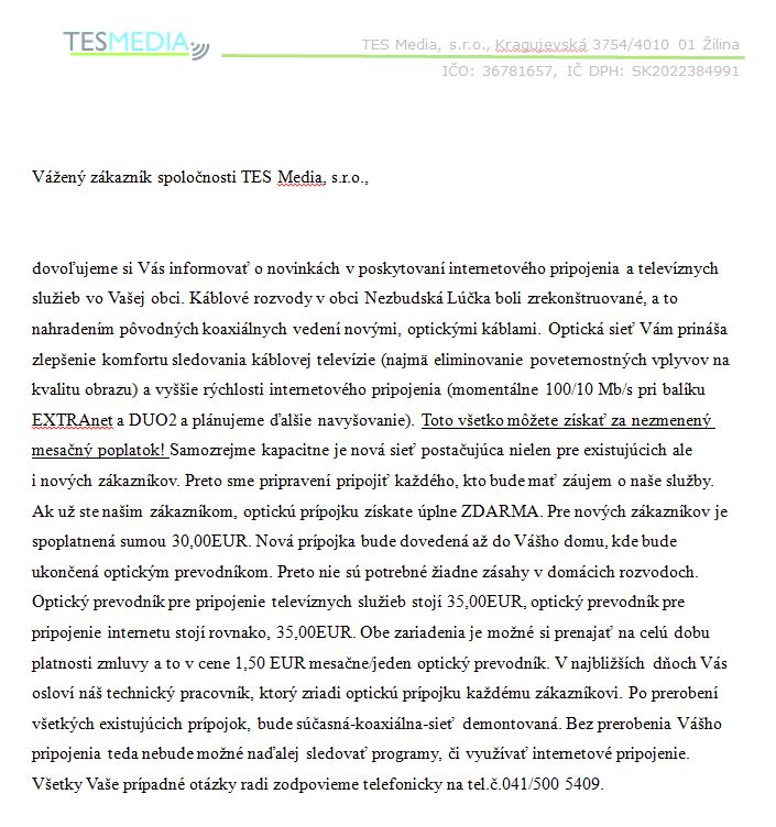 Spoločnosť TES Media s. r. o. si Vás dovoľuje informovať o novinkách v poskytovaní internetového pripojenia a televíznych služieb v Našej obci.