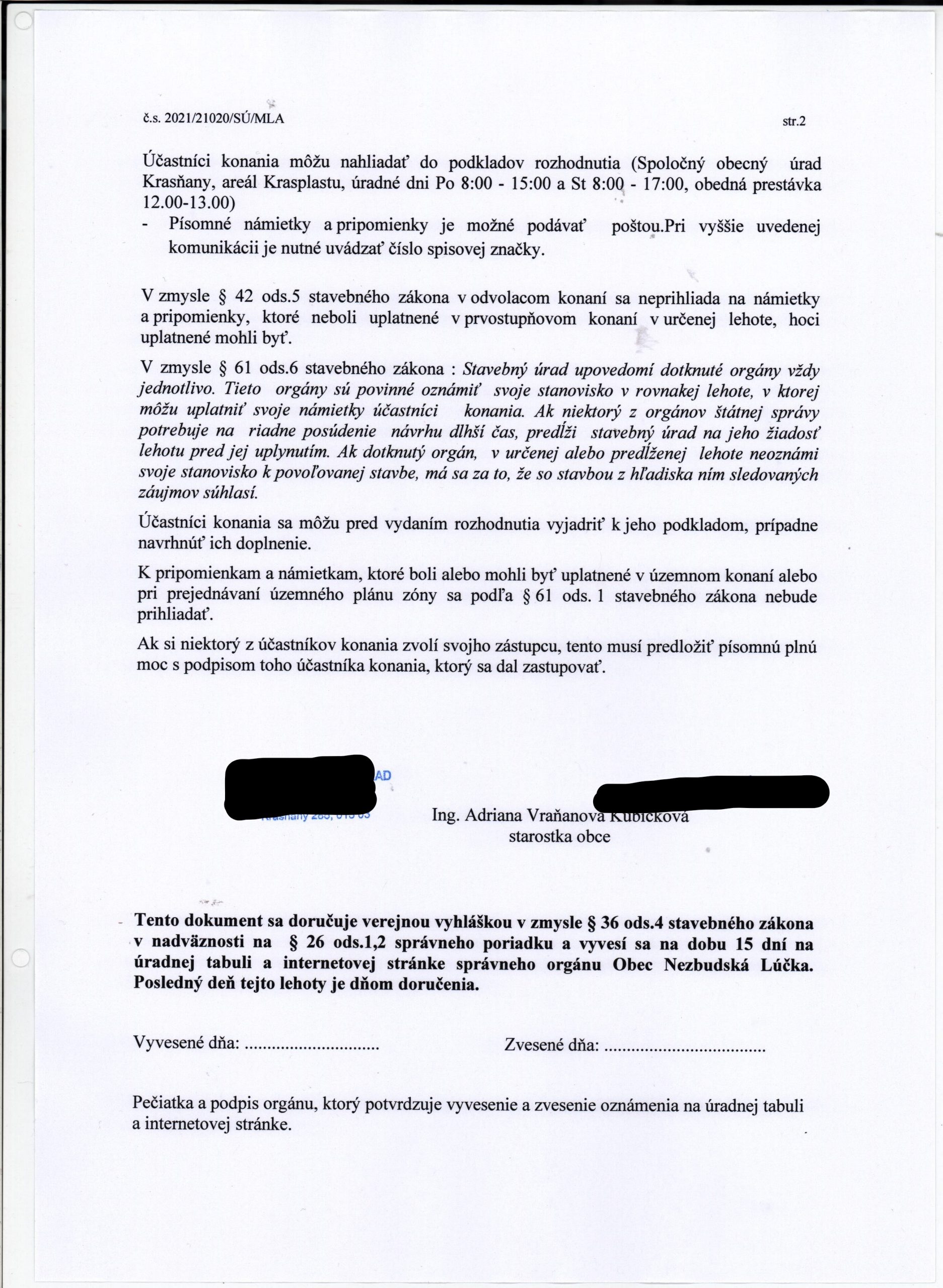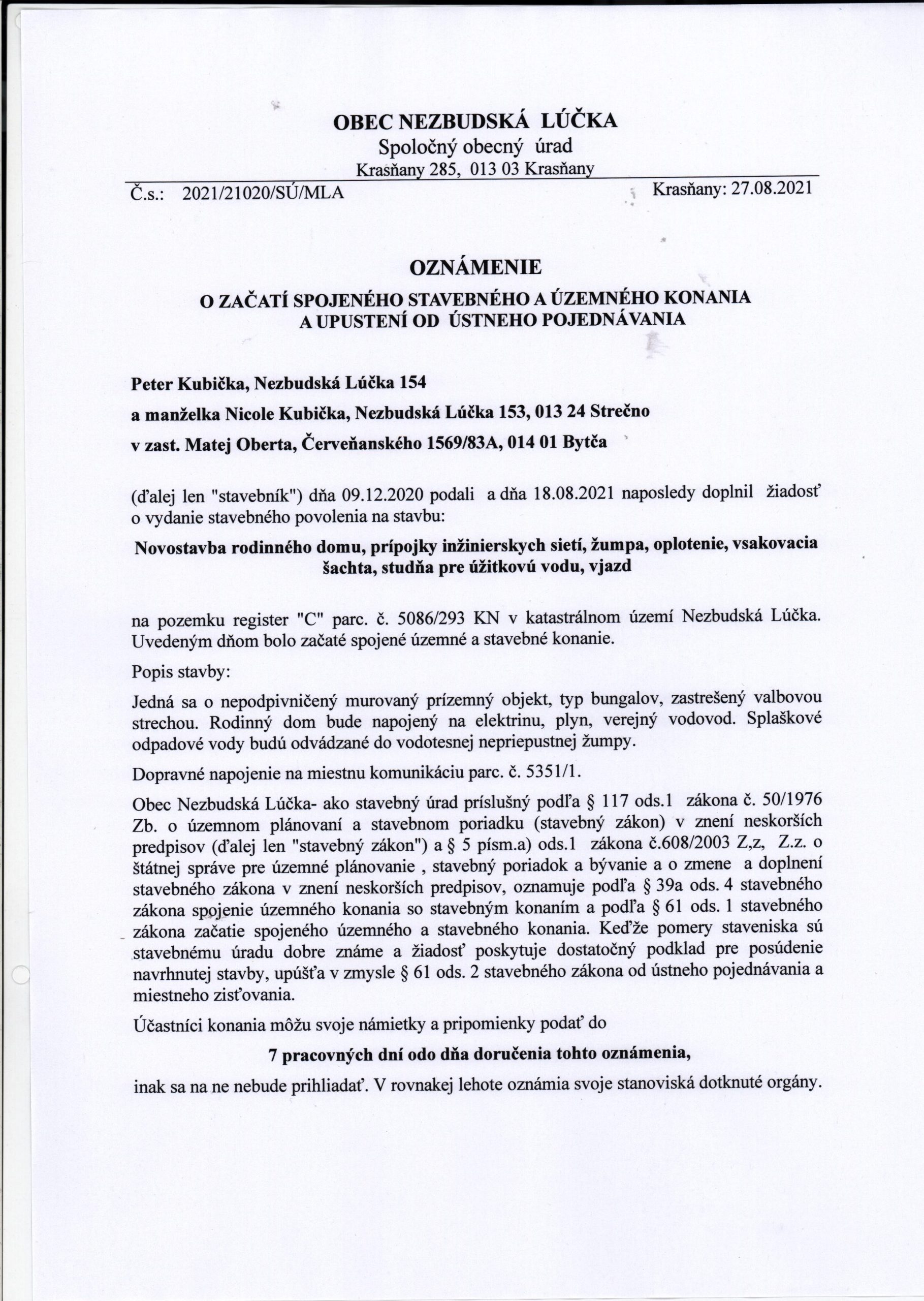 OZNÁMENIE o začatí spojeného stavebného a územného konania a upustenie od ústneho pojednávania – Kubička