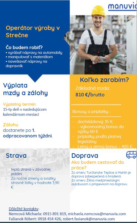 Spoločnosť Manuvia Jobliner, s. r. o. informuje o ponuke práce v Strečne