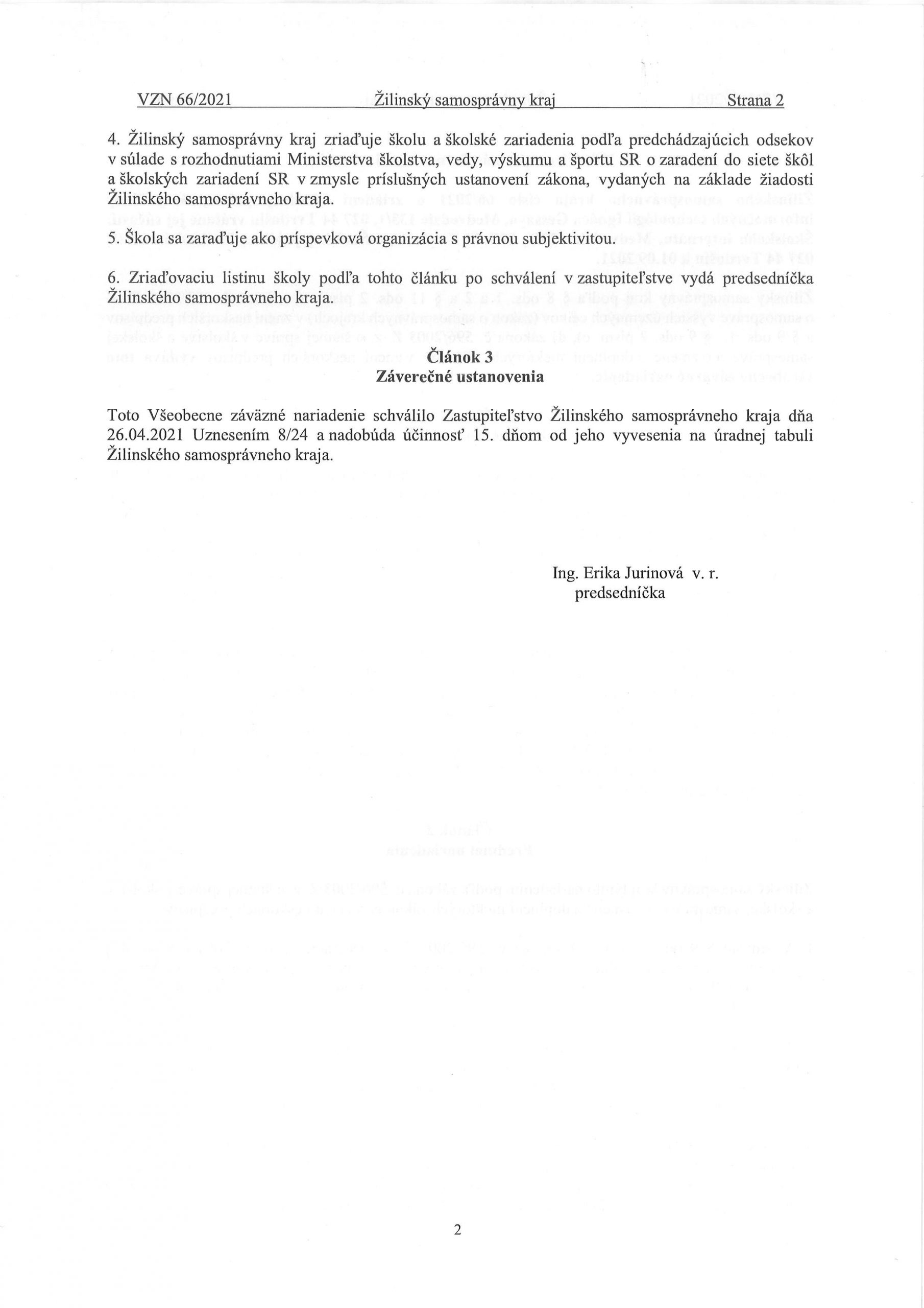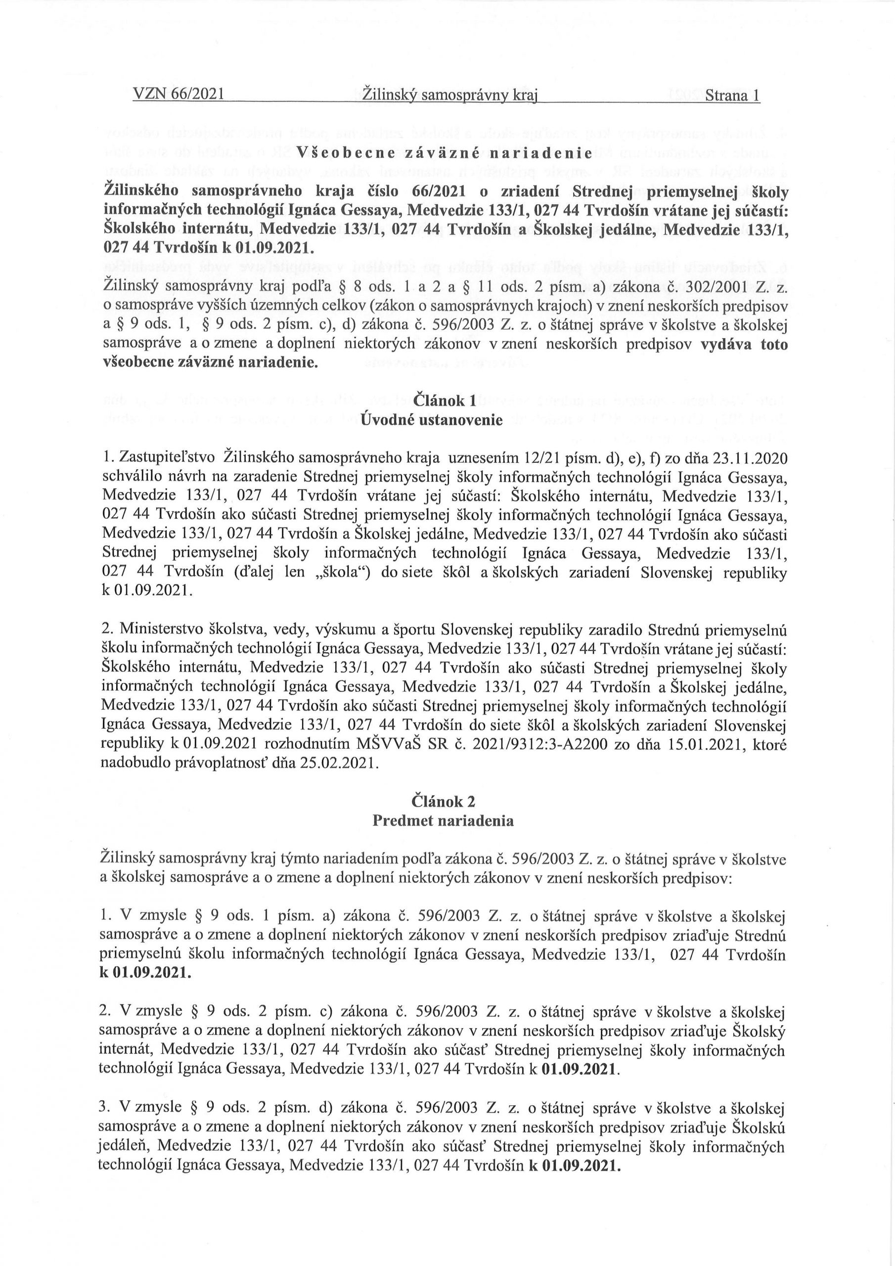 Žilinský samosprávny kraj informuje o novom VZN, ktoré bolo schválené na zasadnutí Zastupiteľstva Žilinského samosprávneho kraja dňa 26. apríla 2021. Predmetom VZN č. 66/2021 je zriadenie Strednej priemyselnej školy informačných technológií Ignáca Gessaya, Medvedzie 133/1, 027 44 Tvrdošín vrátane jej súčastí: Školského internátu a Školskej jedálne k 01.09.2021.