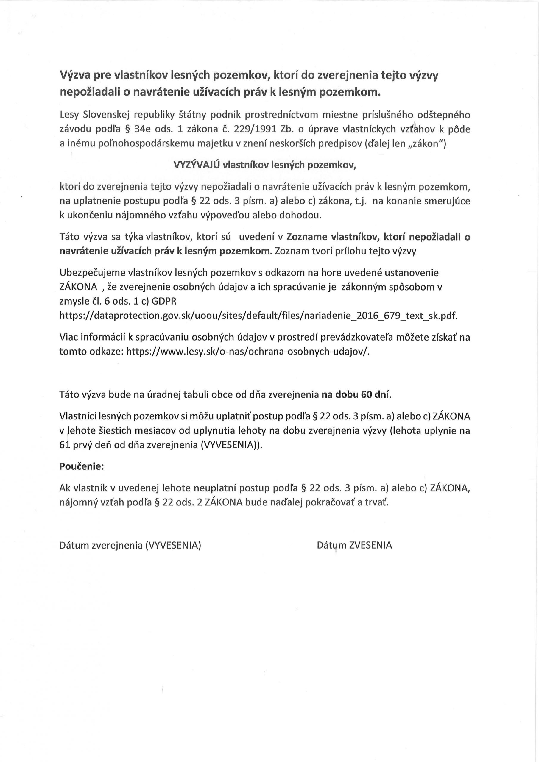 Lesy SR prostredníctvom miestne príslušného odštepného závodu Vyzývajú vlastníkov lesných pozemkov, ktorí do zverejnenia tejto výzvy nepožiadali o navrátenie užívacích práv k lesným pozemkov na uplatnenie postupu na konanie smerujúce k ukončeniu nájomného vzťahu výpoveďou alebo dohodou.