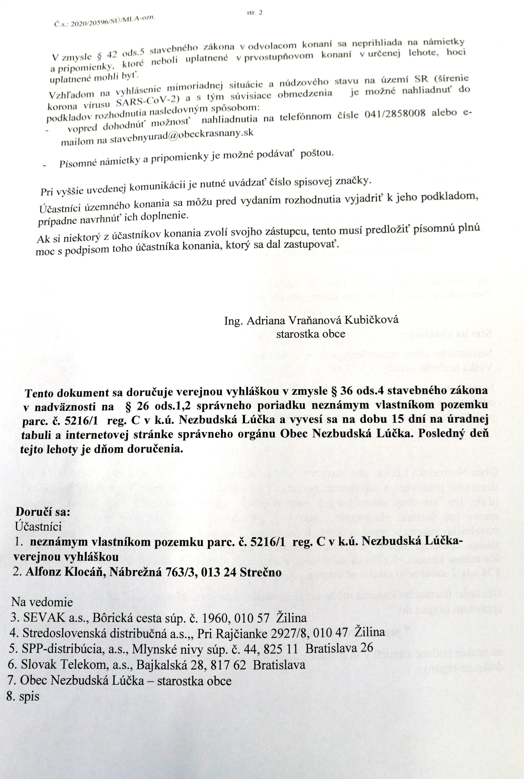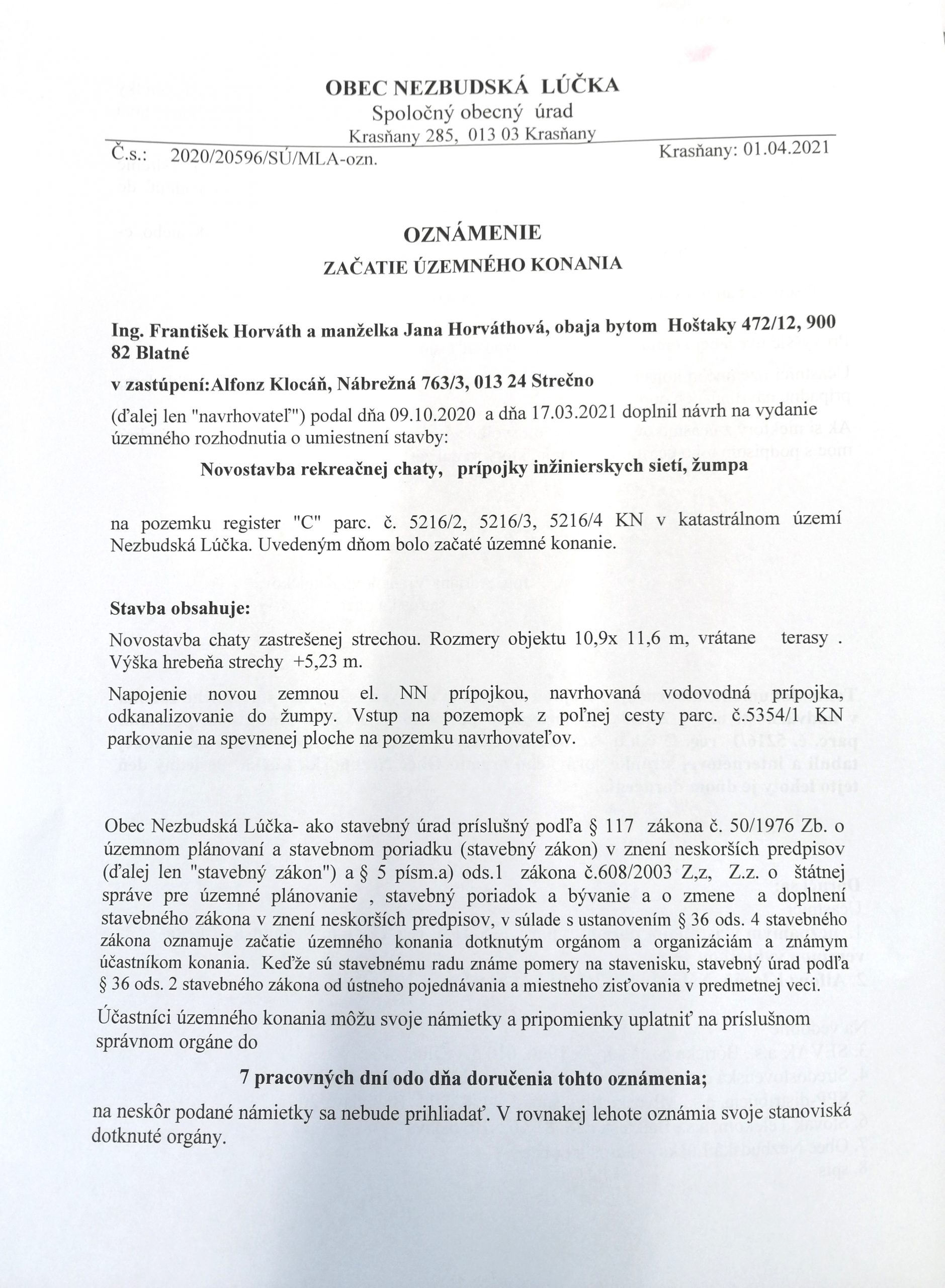 Obec Nezbudská Lúčka, ako príslušný stavebný úrad podľa príslušných zákonov
